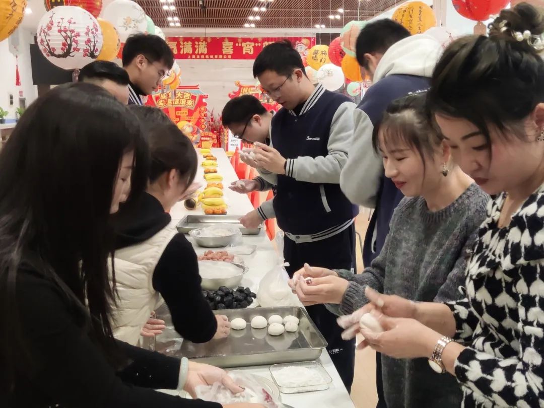 加水,和面、揉面、包餡,揉成型,一個(gè)個(gè)白白胖胖的元宵就出現(xiàn)在全體員工眼前。胖乎乎的大湯圓,吃了就元?dú)鉂M滿;小巧玲瓏的小湯圓,勝在可愛又喜慶。