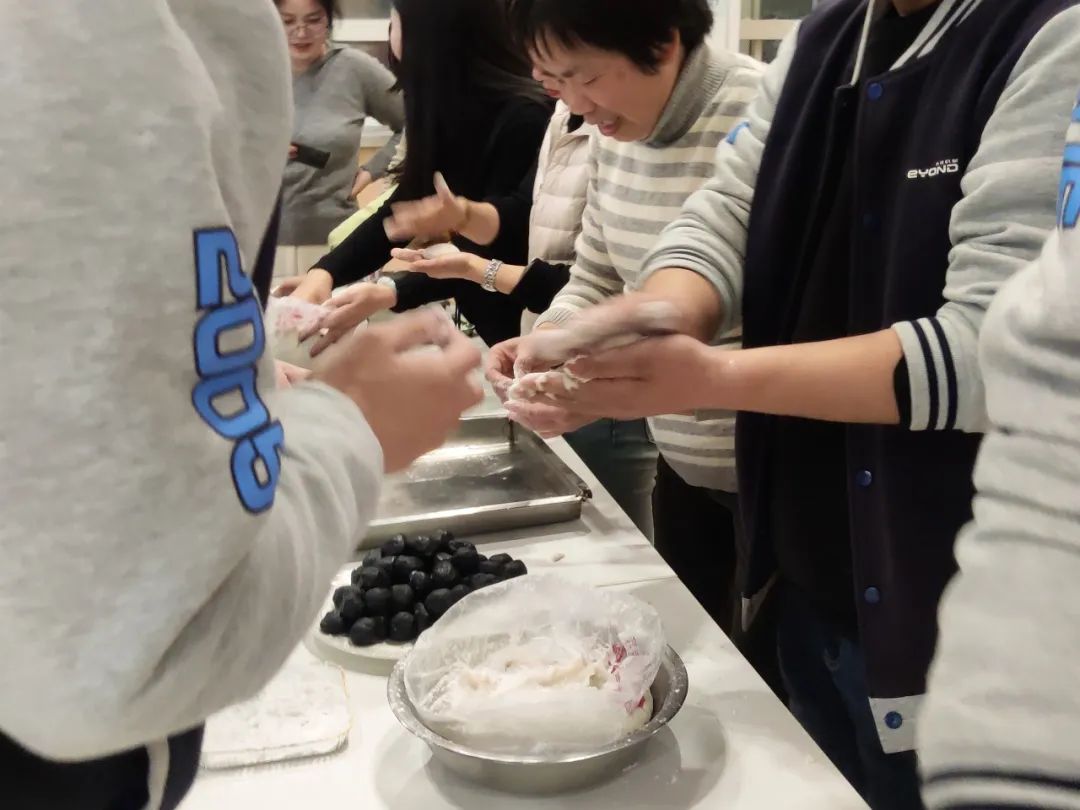 加水,和面、揉面、包餡,揉成型,一個(gè)個(gè)白白胖胖的元宵就出現(xiàn)在全體員工眼前。胖乎乎的大湯圓,吃了就元?dú)鉂M滿;小巧玲瓏的小湯圓,勝在可愛又喜慶。